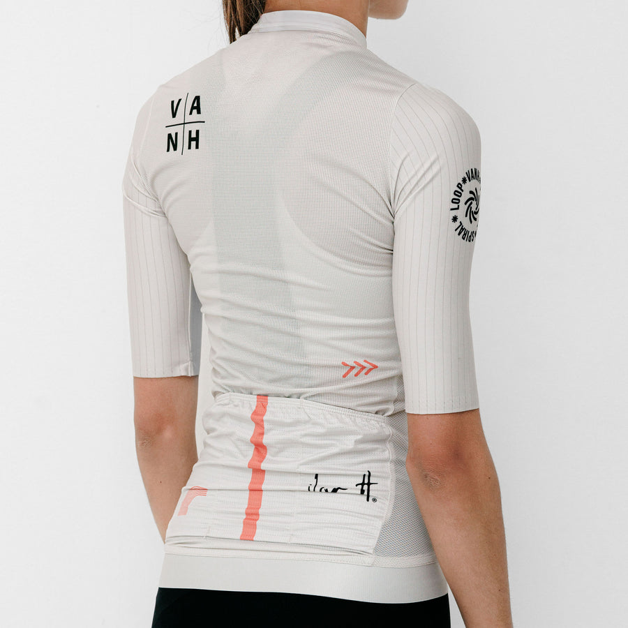 The Women's Positive Spiral Jersey is a technical, lightweight piece designed for elite comfort and a modern aesthetic. Featuring a subtle pinstripe mesh texture and a clean, off-white palette, it balances high-performance ventilation with a sophisticated look.